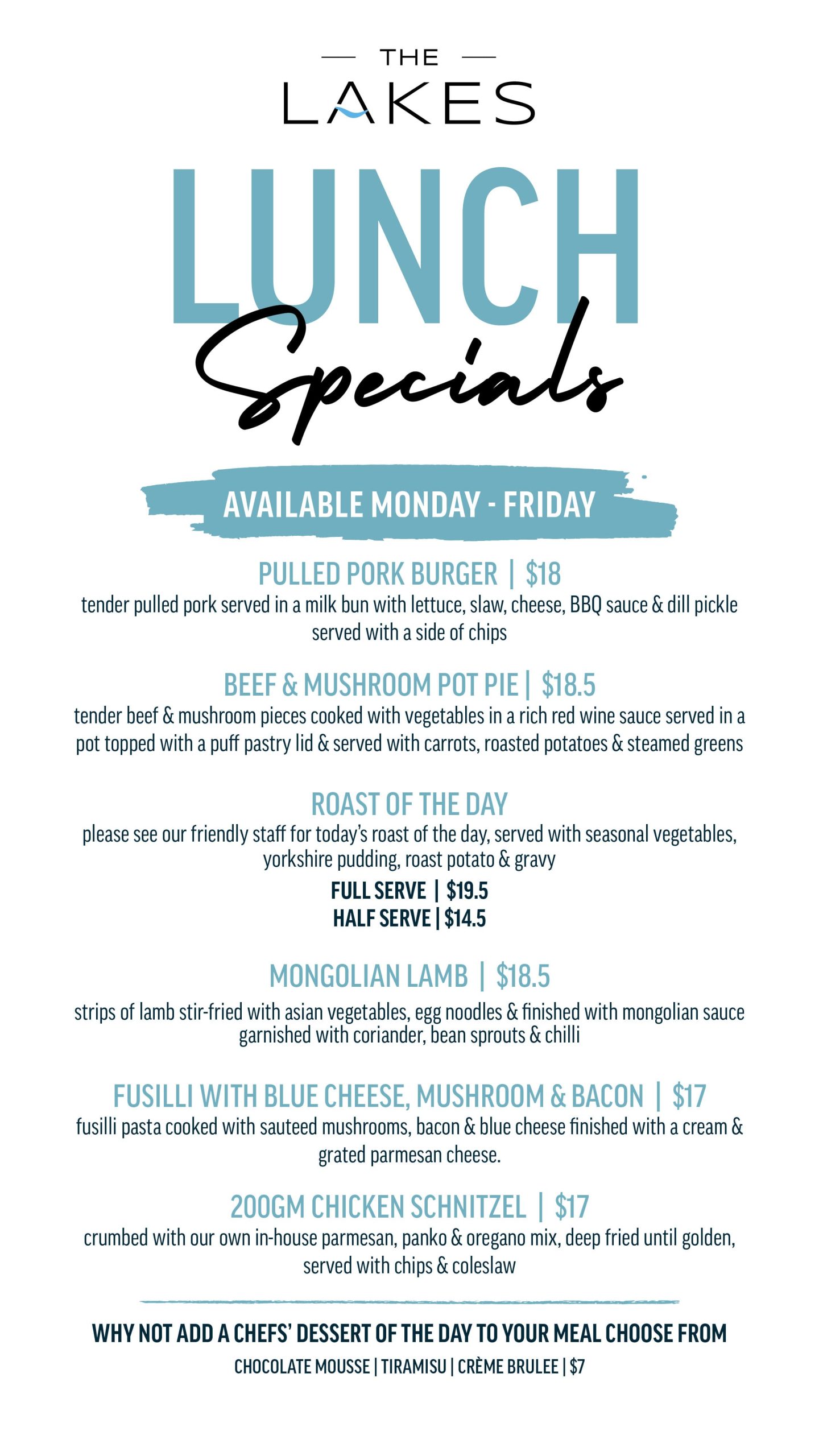 Choose from our range of delicious aromatic pizzas or house-made burgers. Available from 12pm daily. Lakes Bistro’s bar menu features a selection of nibbles and snacks perfect for catching up with friends. We recommend you pair them with your favourite drink while watching live sport on the best big screen in town!